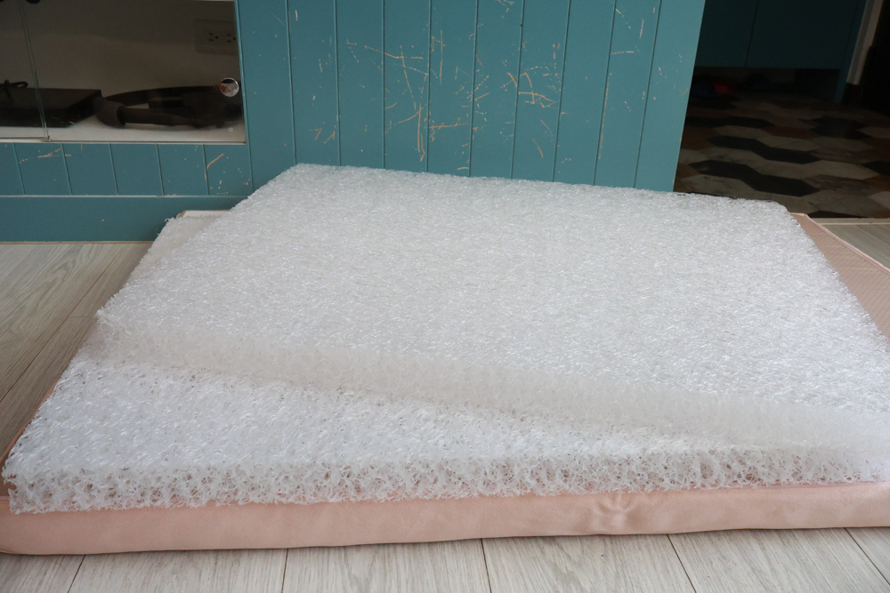 摸起來不像傳統厚重的棉被,而是 柔軟中帶點彈性,所以狗狗躺下去不會塌陷,依然保持蓬鬆澎澎的樣子。最讓我驚訝的是,就算天天睡,形狀依然漂亮,不會變成扁扁的「地墊」床。