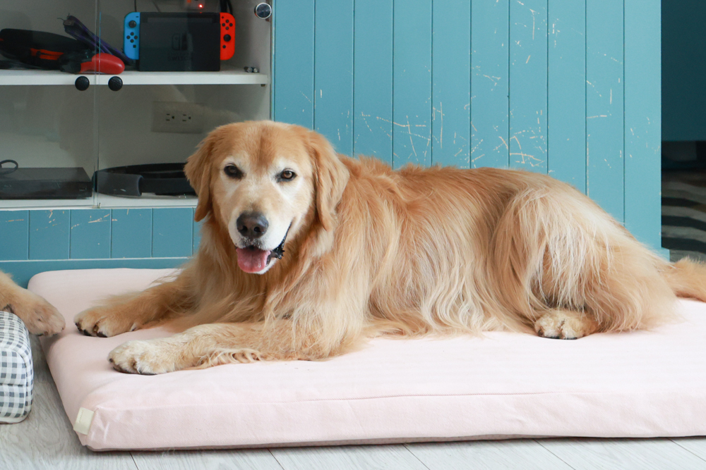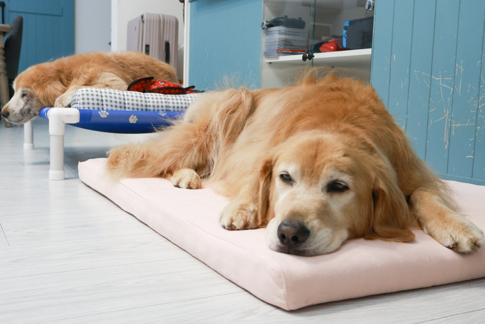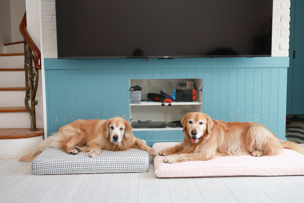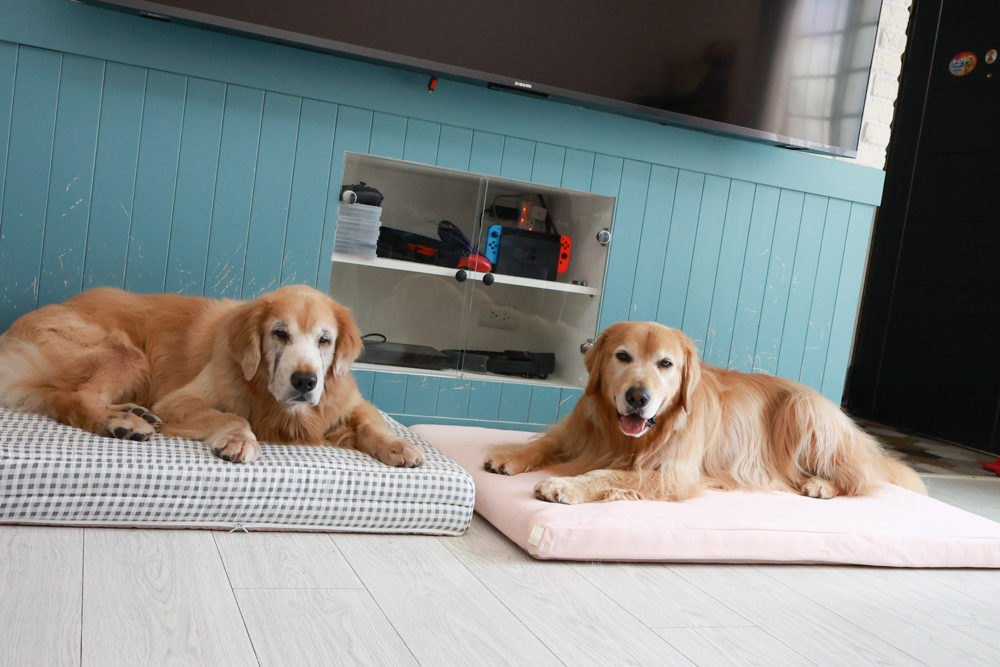阿尼睡覺時喜歡翻來翻去,這種雙層結構讓牠不管趴睡、側睡或蜷縮,都能找到舒服的姿勢。。阿洛則比較霸氣,攤平全身也一樣有支撐,完全不怕「塌陷變形」。就像我們人睡高級雙層獨立筒,狗狗版的豪華享受就是這種感覺!