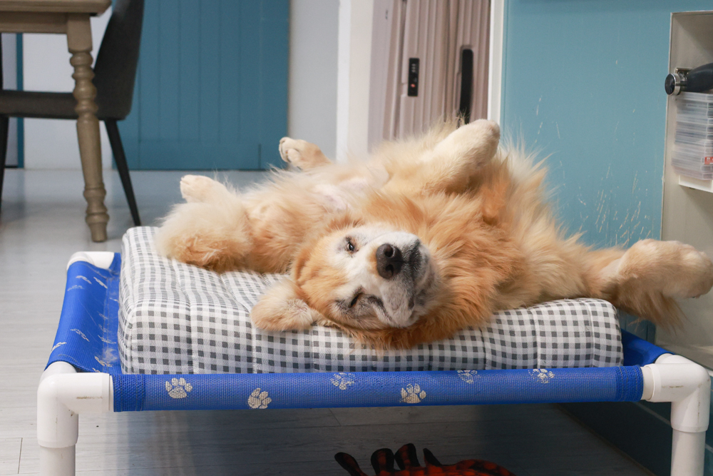 阿洛一躺上去就會自動縮成毛球,整個窩進去像在抱棉被,表情滿滿都是安全感 🐶💤。