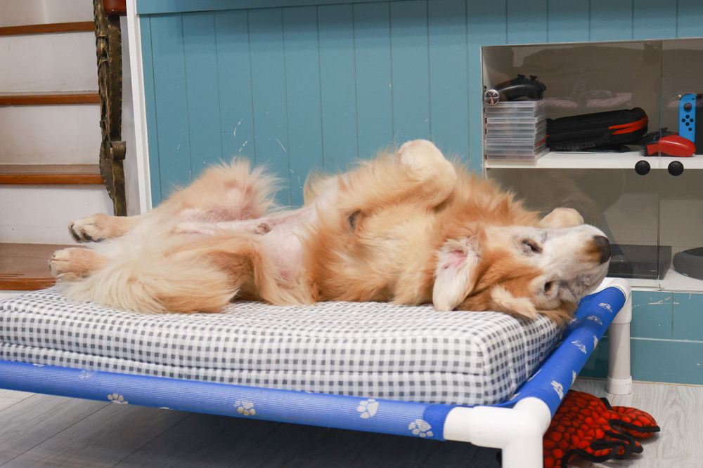 阿洛 38 公斤,一屁股坐上去的瞬間,我心裡還想:「糟了,會不會塌一個洞?」結果完全沒有!床墊就像人用的護脊床,靠 3D立體彈簧結構 把壓力平均分散,阿尼睡得四腳朝天,脊椎還是被穩穩托住。這設計不僅能保護脊椎,連 關節負擔都減少,睡醒後行動更輕盈~阿尼以前常常睡醒會懶洋洋地不想動,但換了這張床後,起身更俐落,關節沒有卡卡感,真的很有差別。