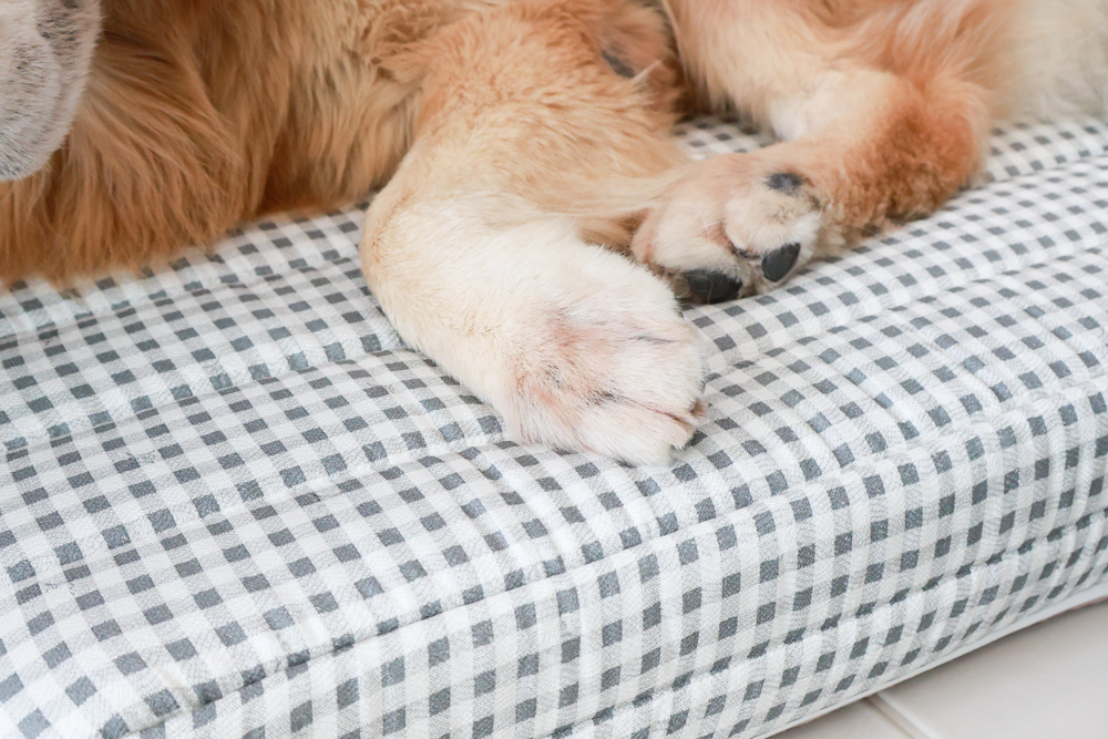 絎縫 5 盎司棉:床包裡加了厚度,保溫又有彈性,狗狗躺上去就像壓在厚棉被上一樣舒服。
