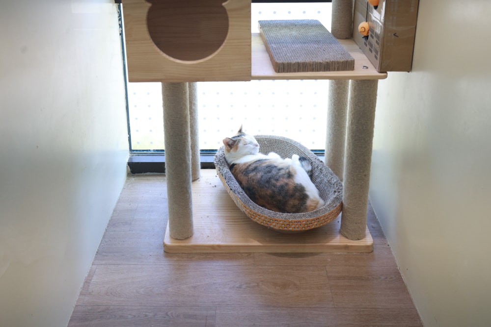 接著走進貓舍,氣氛又完全不一樣~貓咪們有落地窗、有跳台、有陽光。一隻小橘貓在高台上伸懶腰,另一隻花貓則靠在窗邊看山景,整個畫面安靜又詩意。這裡的空間設計真的超用心,讓貓咪也能保有牠們的自由與優雅,完全不壓迫。