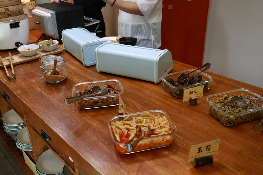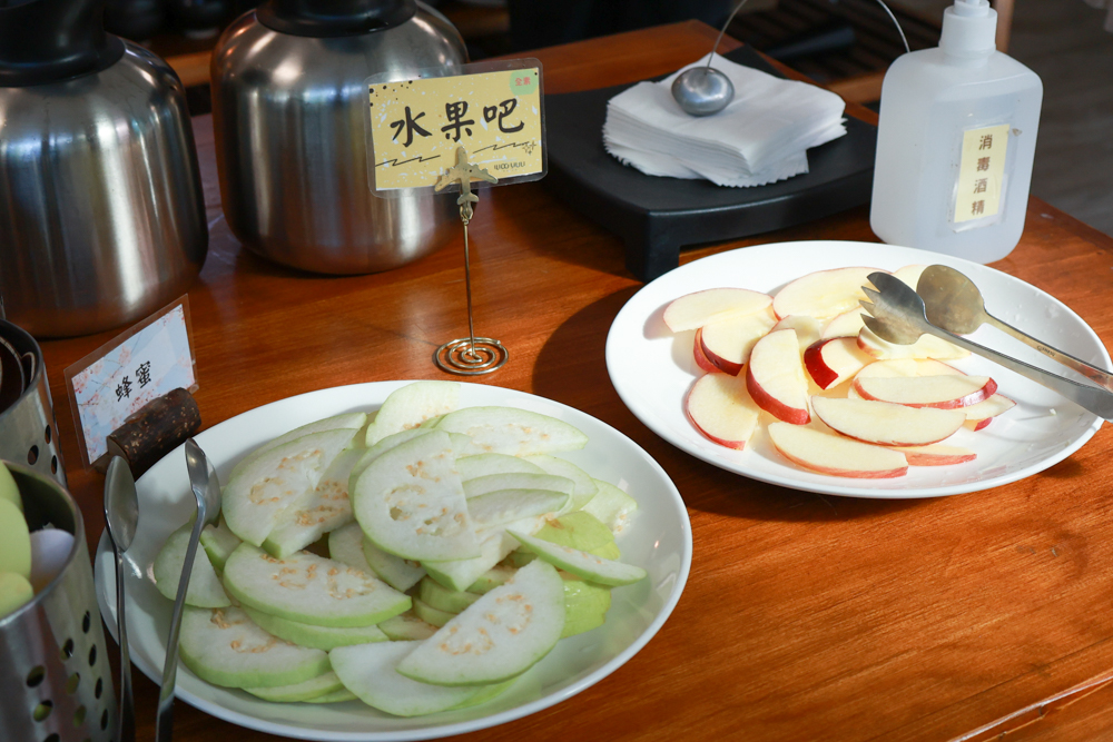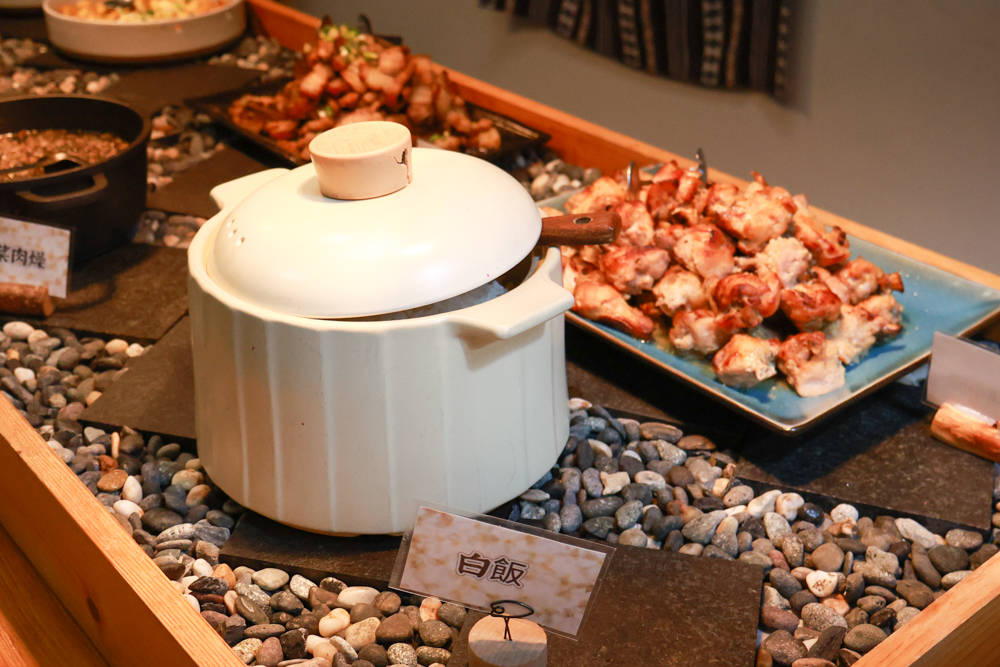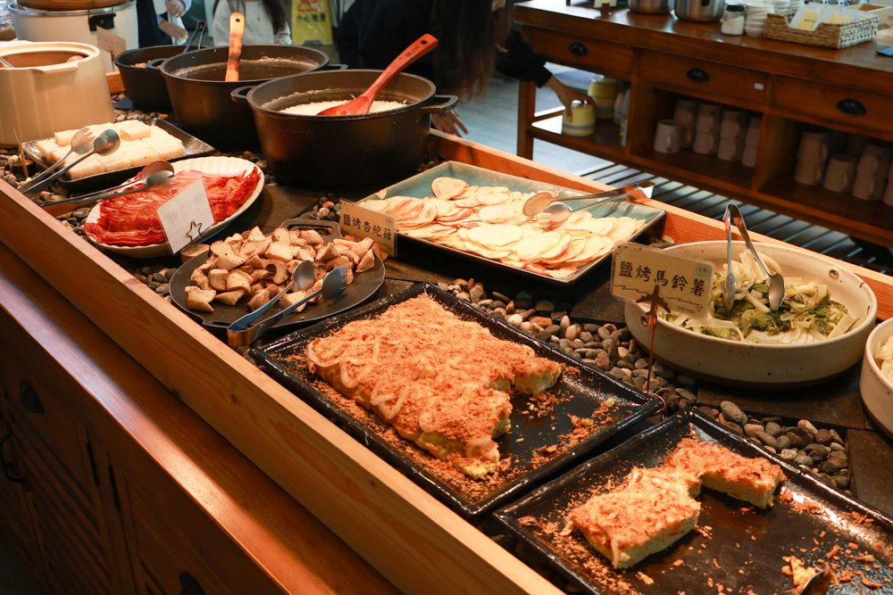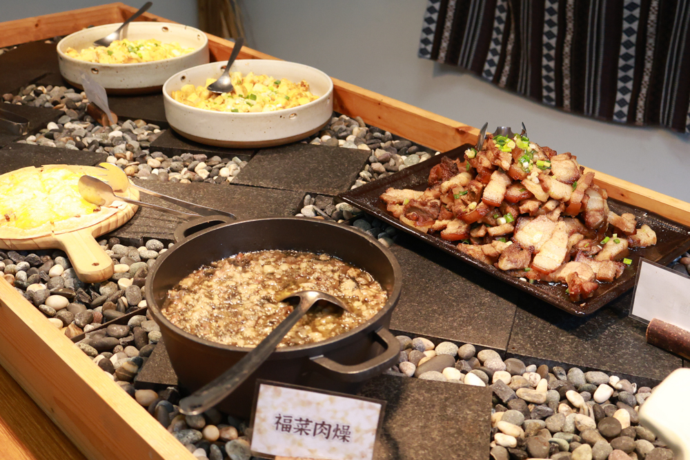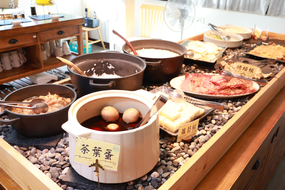 霧語的早餐是中西式自助餐形式,選擇豐富又充滿驚喜。餐檯上擺滿清粥、掛包、馬鈴薯、大阪燒、熱炒青菜、滷蛋、小菜、沙拉、麵包、水果、咖啡與果汁,最吸睛的就是那一鍋滷得香氣四溢的茶葉蛋與刈包DIY。自己挑選肥瘦適中的滷肉、加入酸菜、花生粉、香菜,再夾進熱騰騰的刈包皮裡,早餐可以品嘗到鹹香結合軟綿口感,真的超幸福!