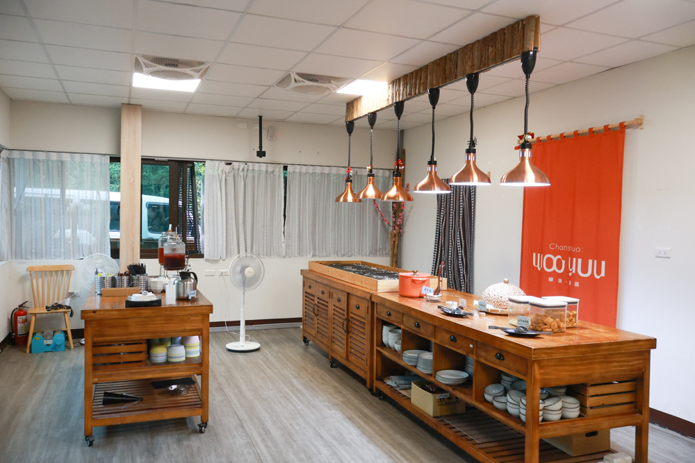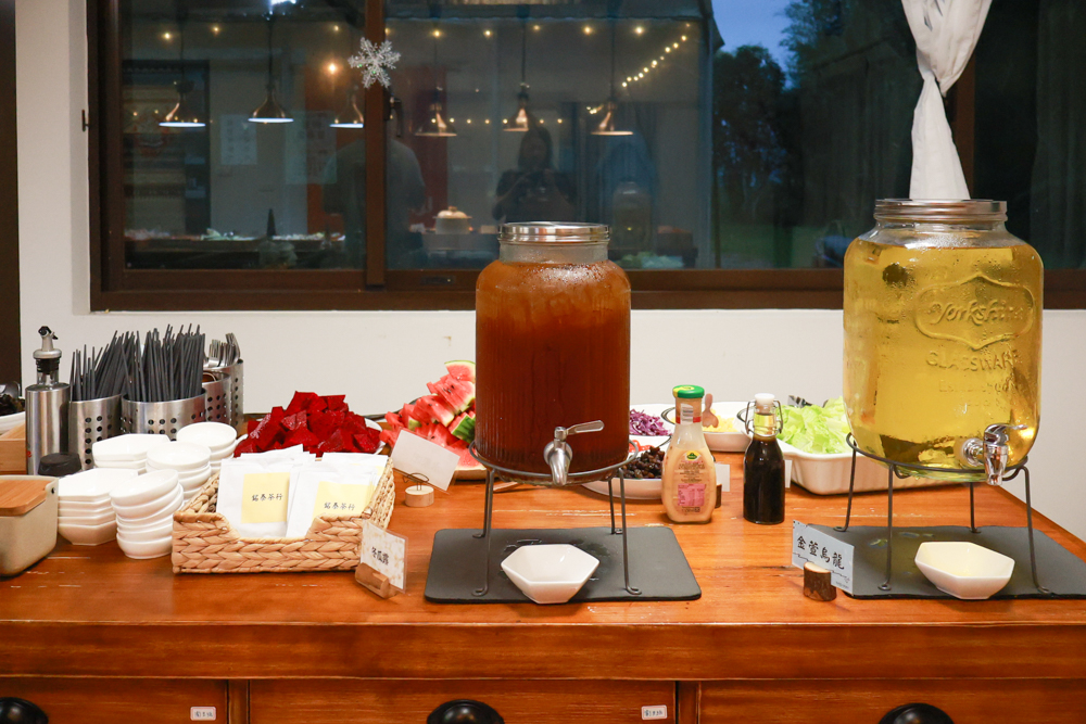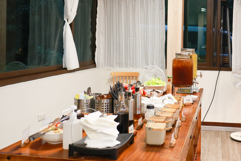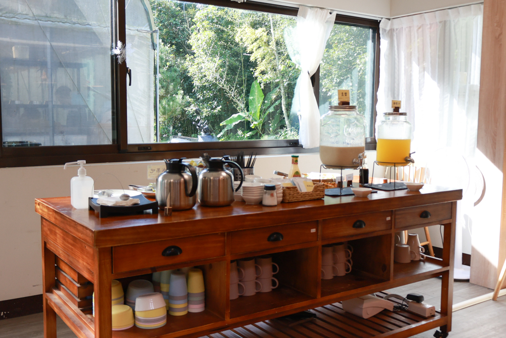 早餐時段則是另一種風景。晨霧還沒散開,窗外的山巒若隱若現,桌上是中西式餐點、粥品、刈包DIY、茶葉蛋與咖啡果汁,
