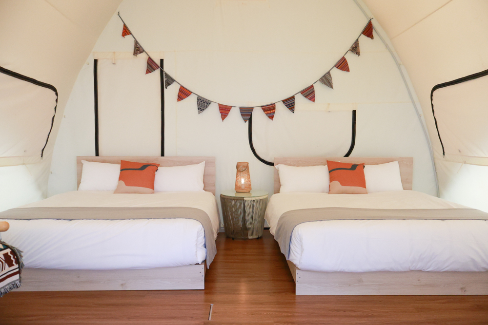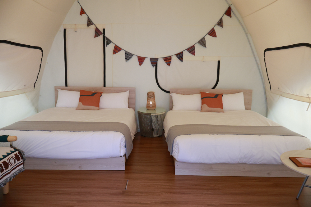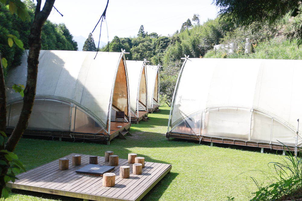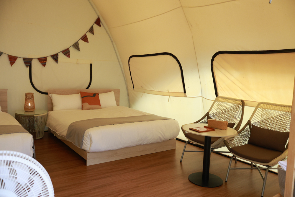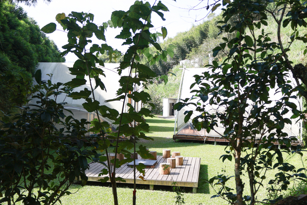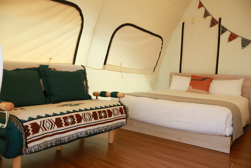 山峰小徑帳篷彷彿是藏在雲裡的小空間。整區僅有六頂帳篷,每一頂都使用蟬說經典的大帆船帳,挑高的空間設計讓人完全不覺得侷促。帳內放著兩張雙人床、沙發椅、小茶几、床邊燈,甚至連木地板與軟墊都有,讓每一個旅客住帳篷卻有像飯店般的舒適感。
