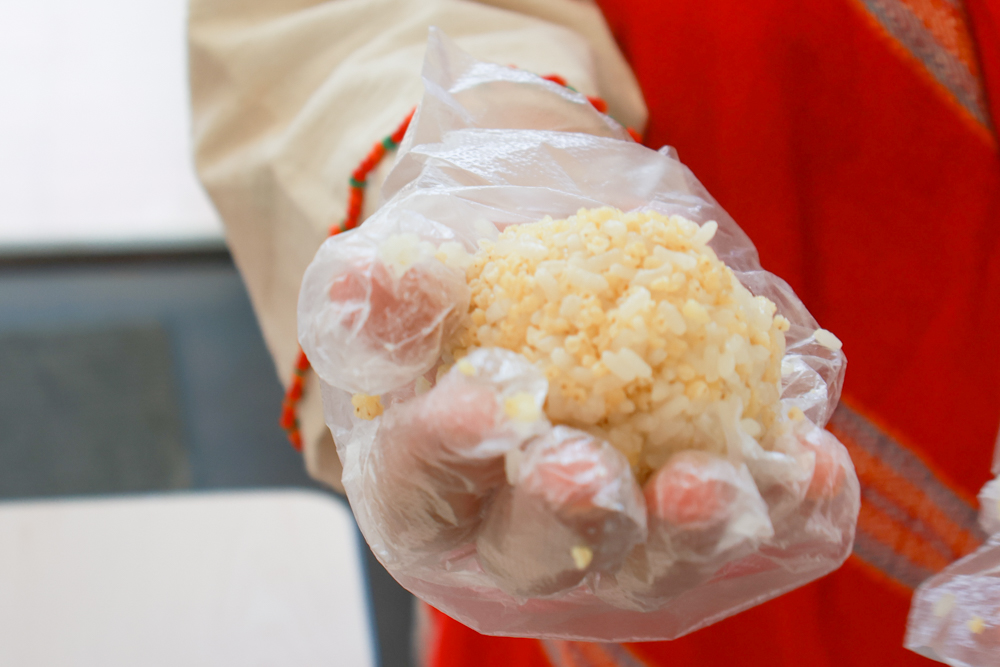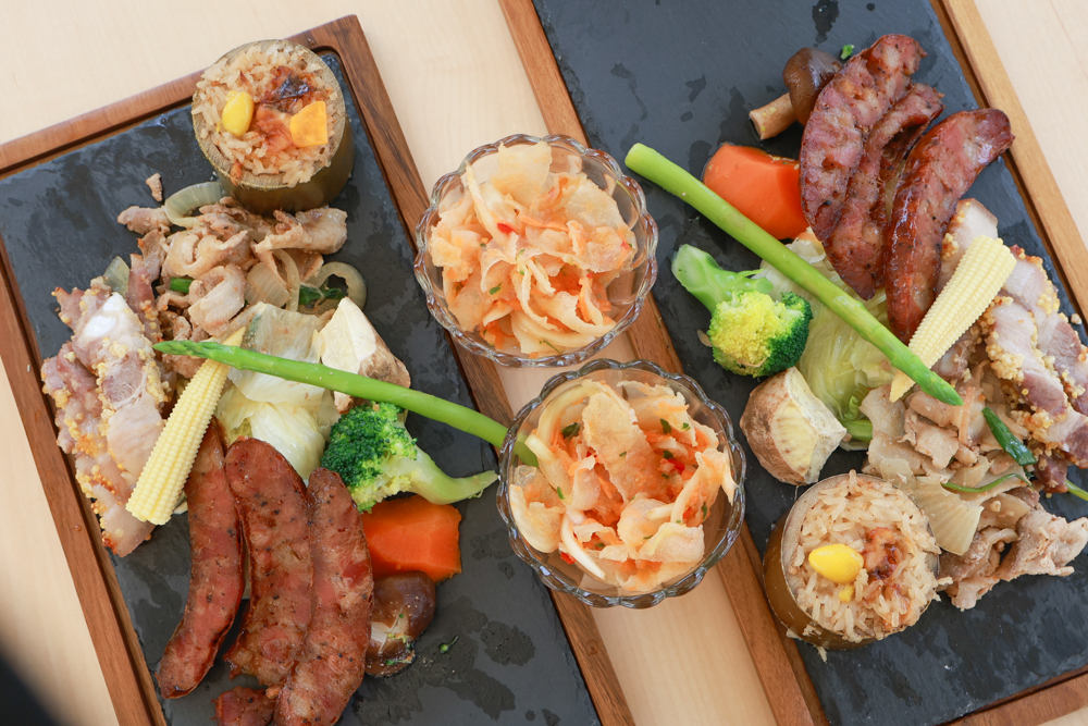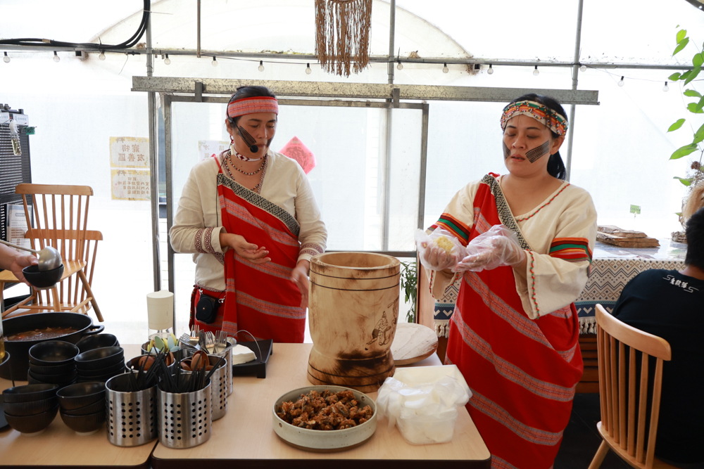 這場餐桌體驗以簡餐+半自助式的方式呈現,菜色中融合了山林的食材與族人日常的智慧。最特別的是那道「獵人飯丸」,早期泰雅獵人上山打獵時攜帶的飯糰,用竹葉包裹、方便攜帶,裡頭是鹹香的山菜與肉末,如今成為一道充滿歷史的美味。