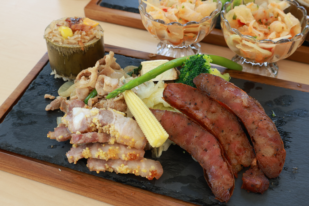 餐點非常豐富,有炒山豬肉、山豬肉香腸、鹹豬肉,另外還有竹筒飯、時蔬、高山高麗菜!!