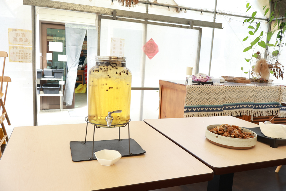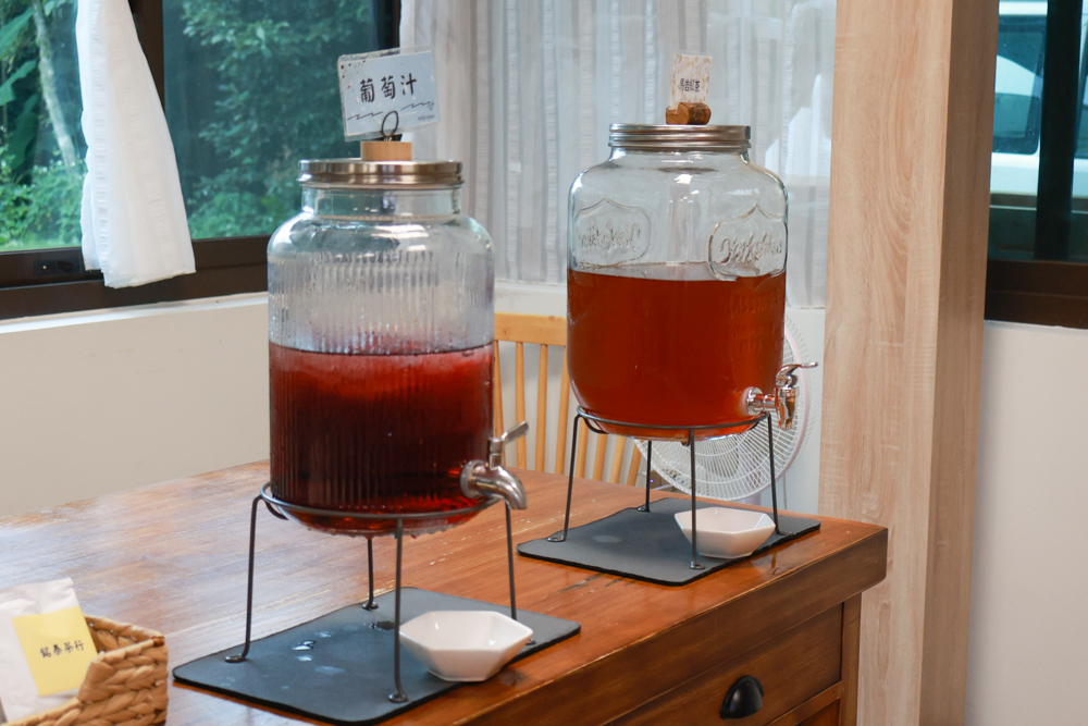 Check in 後,14:30 開始就是超療癒的迎賓點心時間!餐檯區滿滿陽光灑落,桌上擺著餅乾、小鬆餅、綠豆湯和冷熱飲,旅人們都靜靜享受這份午後的悠閒。