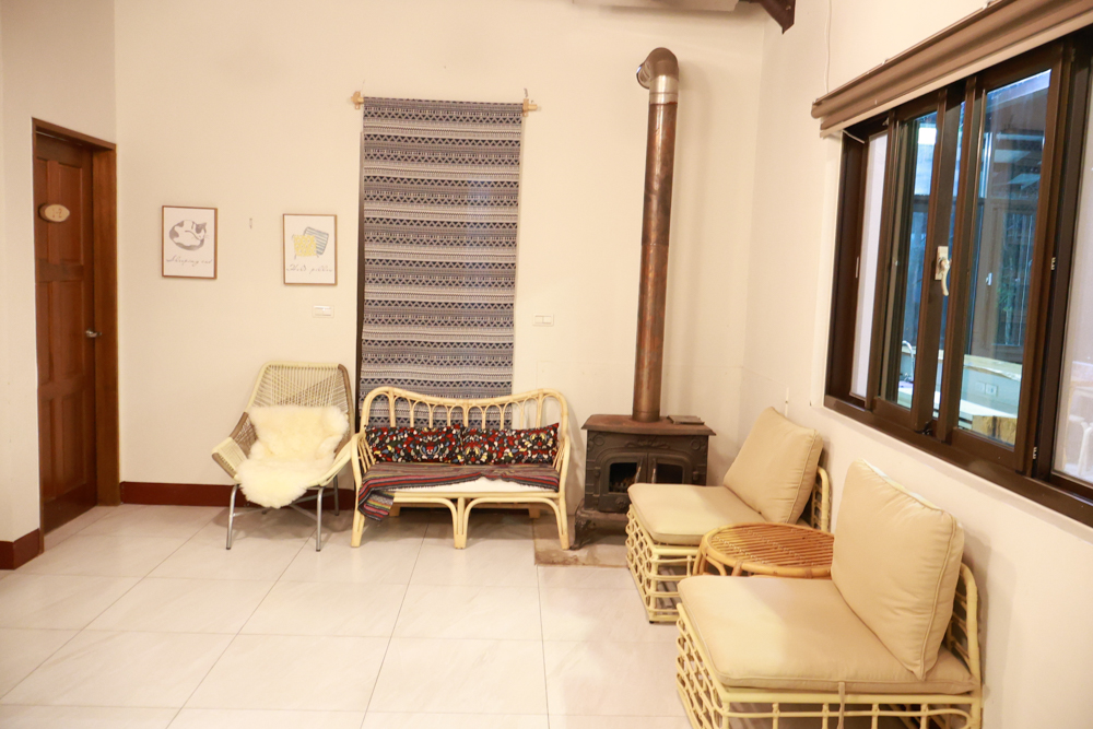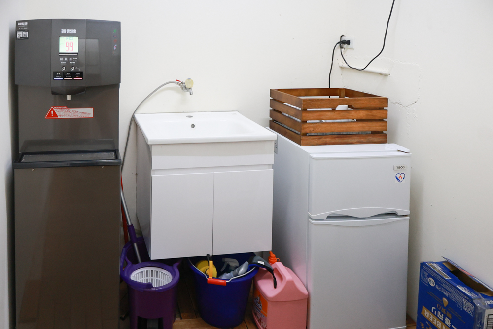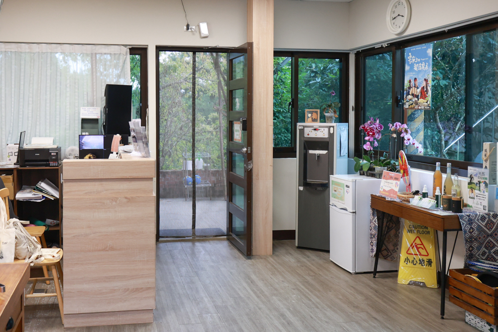 撥雲小屋一樓有玻璃屋公共空間,擺放了誠實商店、飲水機,以及幾張桌椅,可以讓房客在此聊天、休憩