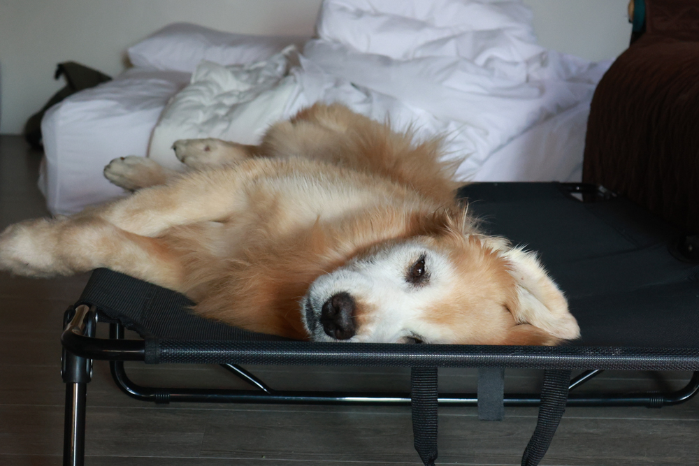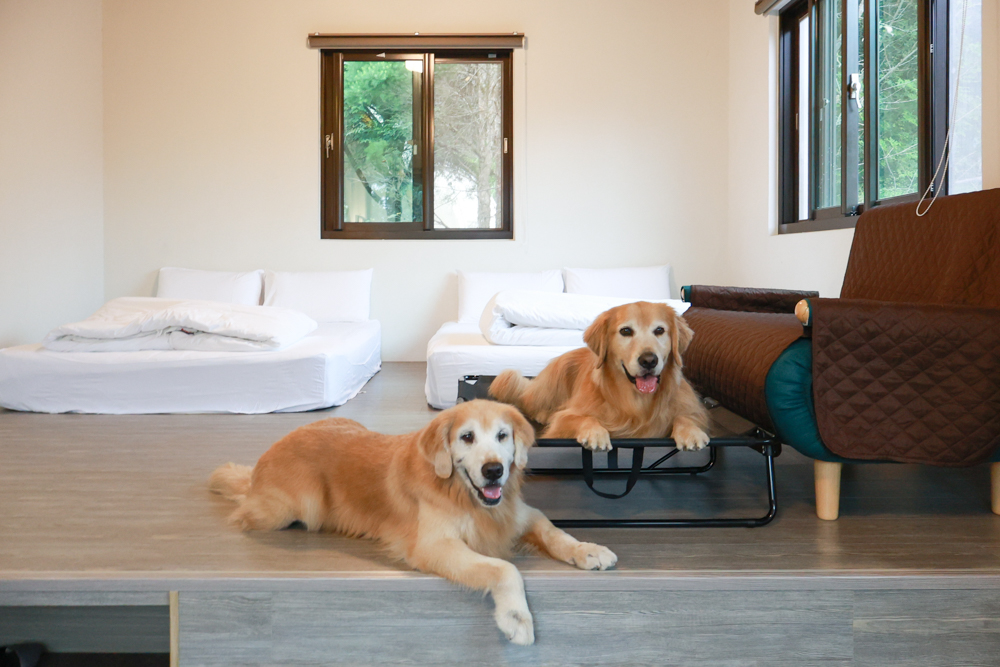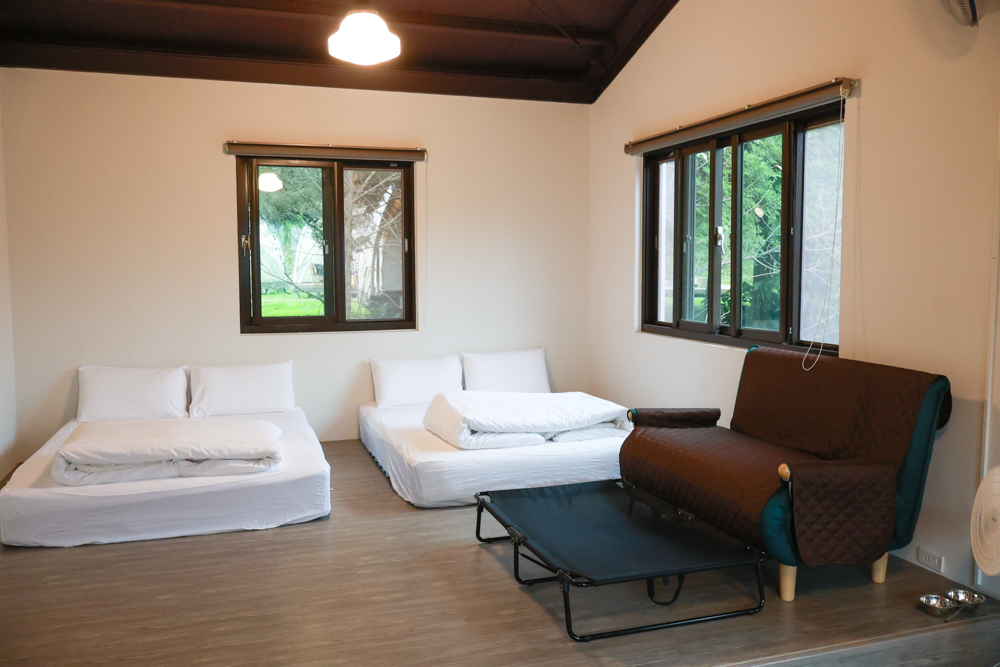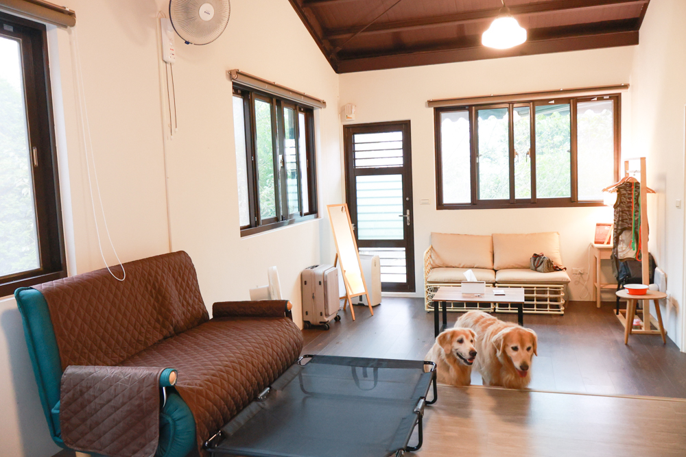 這次我們入住的是撥雲小屋F棟,一進門就被簡約有質感的房間吸引,和式地板上擺放了兩張雙人床、沙發,還有一張毛孩專屬的高架涼床!!另外一區還有一個小巧細緻的小客廳!!
