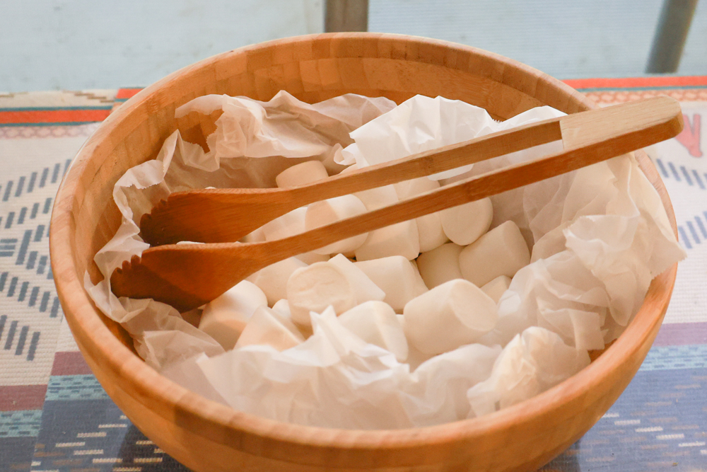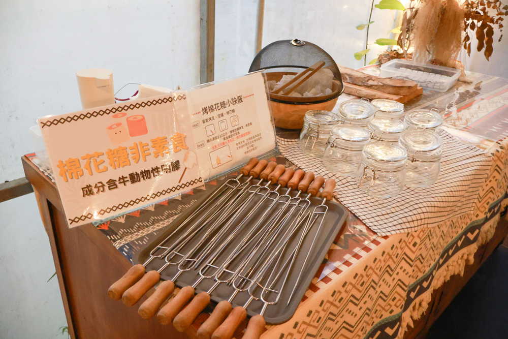 吃飽後,服務人員提醒我們到領取棉花糖組,準備迎接接下來最期待的營火時光🔥,邊走出餐廳,外頭的霧氣更濃了,