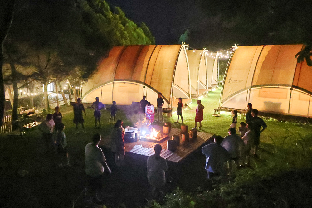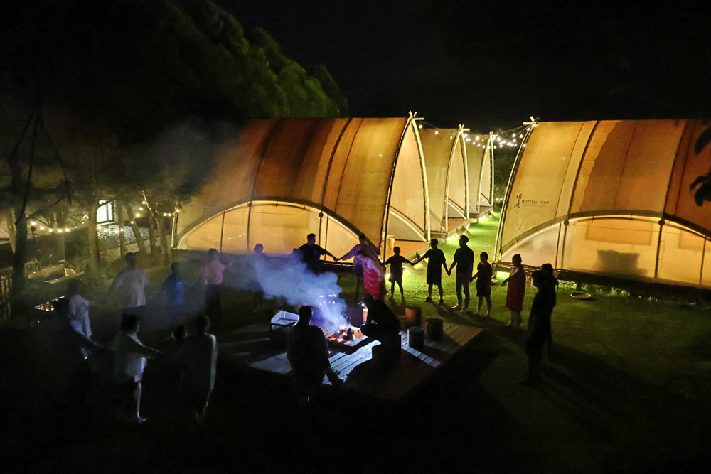 營火就在帳篷區旁點燃,火光搖曳、霧氣漂浮,空氣裡帶著木柴香,每個人臉上都被照得暖暖亮亮的。孩子們圍著火堆烤棉花糖,、一邊看霧氣被火光照出閃閃光影,那種溫度與氛圍,是城市裡絕對感受不到的